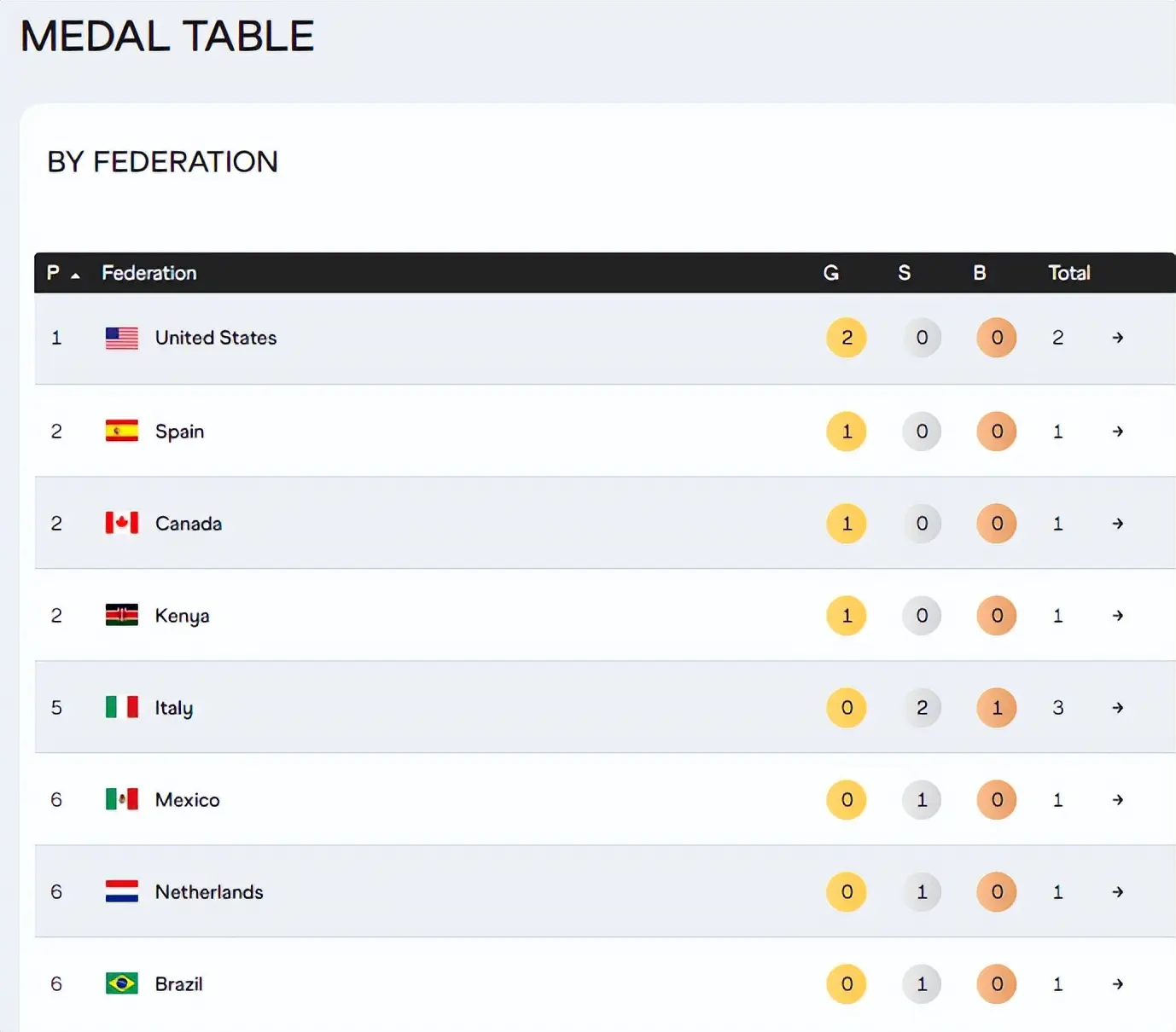 首个比赛日有四支队伍获得金牌,除了美国队获得两金之外肯尼亚、加拿大、西班牙各获得1金。共有12支队伍首日就获得奖牌,其中东道主日本队首日获得一枚铜牌显得弥足珍贵,随后日本队在男子110米栏、女子标枪等项目上可能还有一些争夺奖牌的点。
