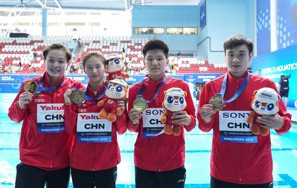 新华社新加坡7月26日电(记者夏亮、李嘉)26日,2025年游泳世锦赛跳水项目迎来首个比赛日。由陈艺文、陈芋汐、曹缘、程子龙组成的中国队在混合团体比赛中以39.95分的领先优势夺得项目首金,墨西哥和日本队分获银牌和铜牌。