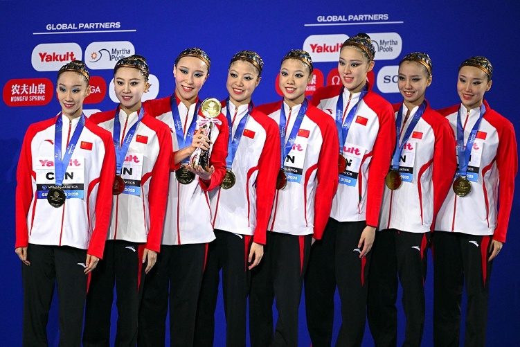 中国花样游泳队以老带新,4位巴黎奥运冠军坐镇,半数队员首次参加世锦赛,赛前中国花游队遭遇前所未有的困难,但运动员及教练团队凭借强大的精神意志和竞技水平,完成全部项目竞赛,包揽了集体三个单项的金牌。