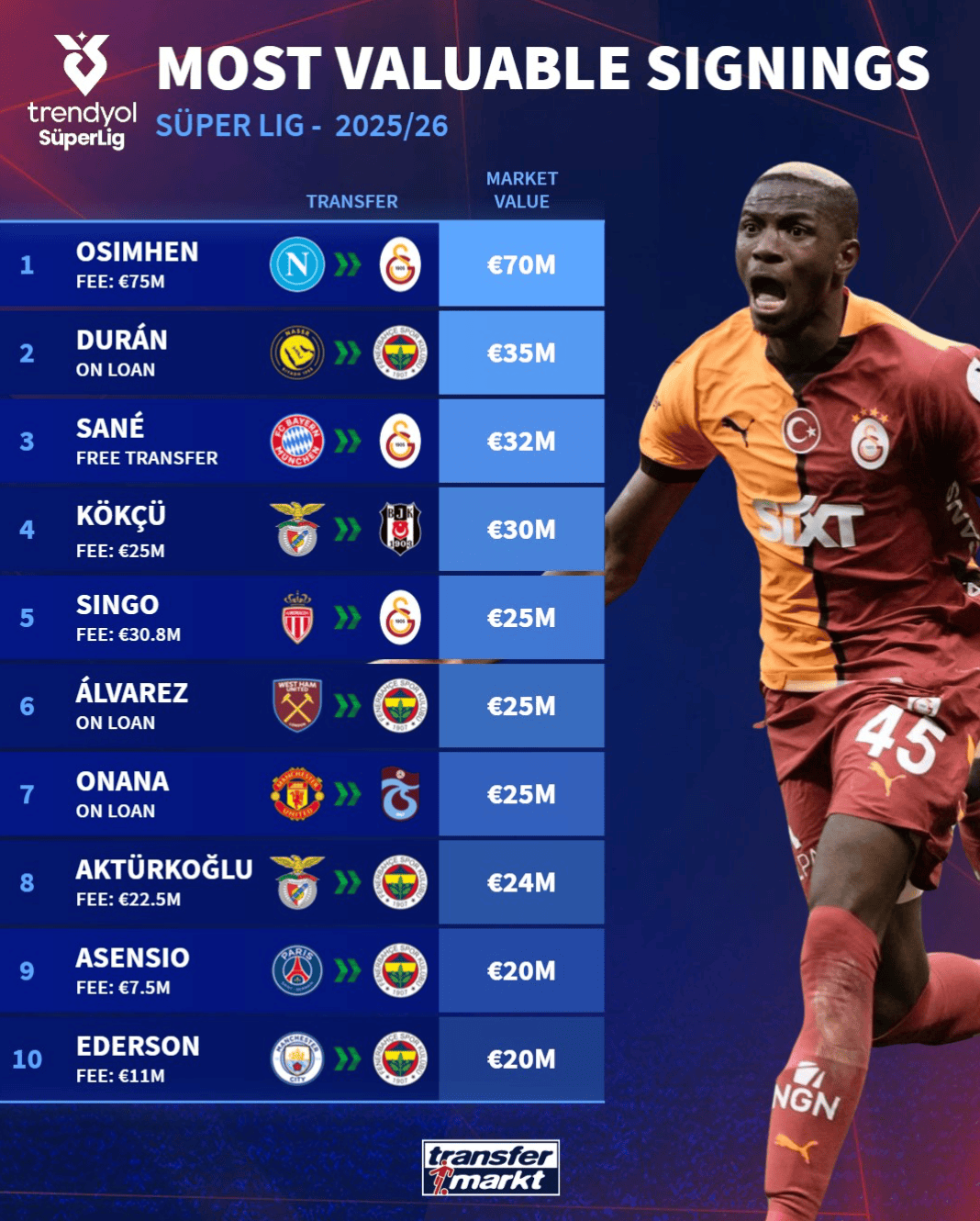 虎扑09月13日讯 德转统计了本季夏窗土超联赛引进身价最高的前十名球员榜单。前那不勒斯球星奥斯梅恩以7000万欧的身价高居榜首。