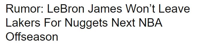 不久前,詹姆斯曾与约基奇的经纪人Raznatovic会面,引发了人们的猜测——明年休赛期詹姆斯成为自由球员后,可能会加盟掘金队。知名詹蜜媒体人Nick Wright表示:“我可以明确地说,那条社媒暗示詹姆斯明年将加盟掘金队的说法,是100%错误的。一年后詹姆斯加盟掘金队的可能性为零。这不是我的个人观点,我很确定这一点。”
