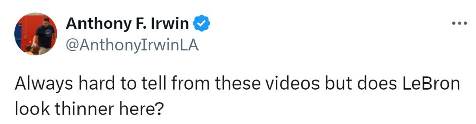 湖人队记Anthony Irwin转发了詹姆斯的训练视频,并配文写道:“从这些视频中总是很难判断,但勒布朗在这里看起来是不是变瘦了?”