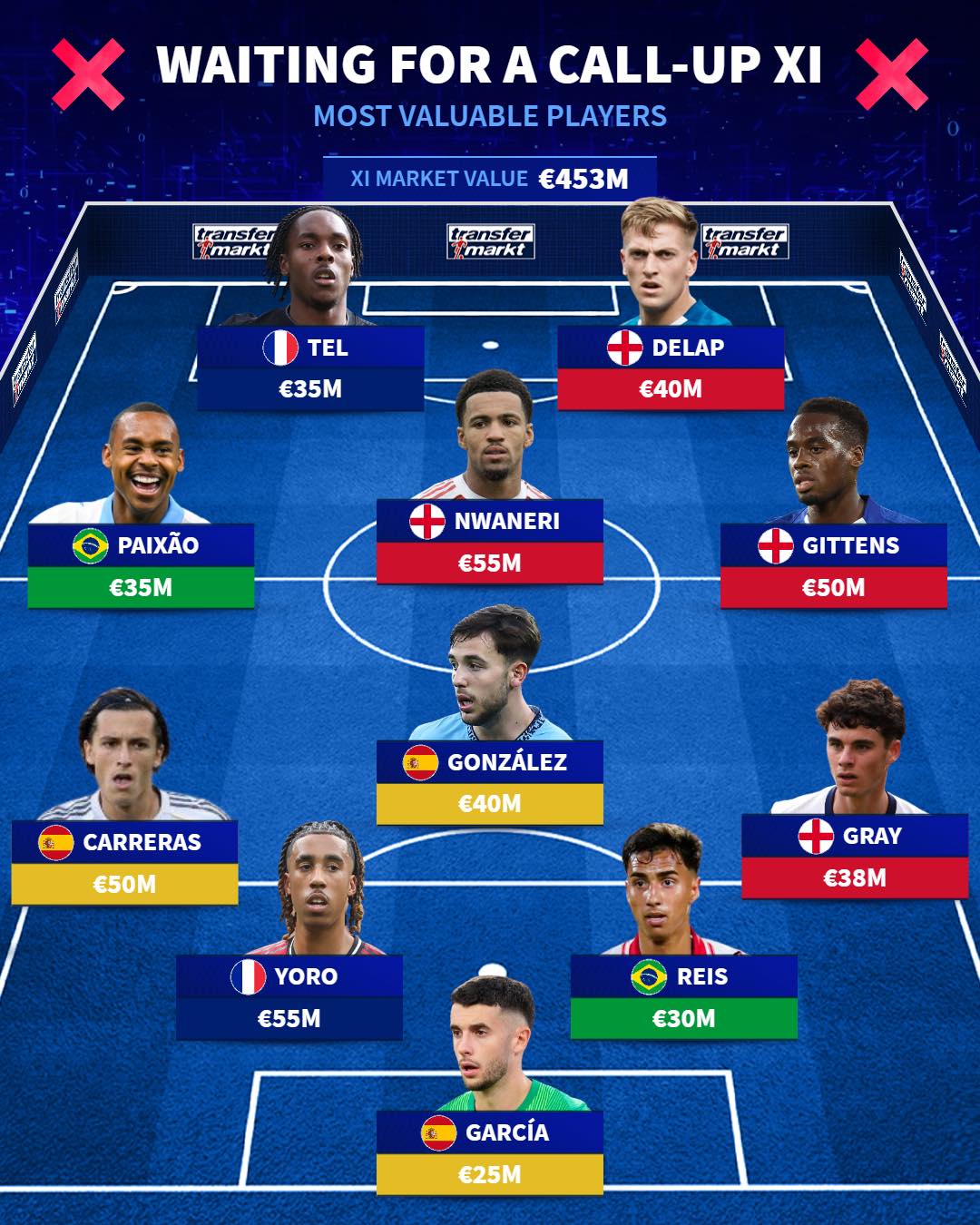 虎扑10月12日讯 知名数据网站《转会市场》(Transfermarkt)评选出了“等待国家队征召的最具身价11人阵容”,这套由年轻新星组成的虚拟阵容总身价高达4.53亿欧元。