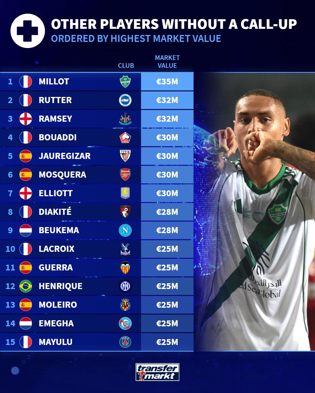 冈萨雷斯(西班牙)—— 4,000 万欧元、恩瓦内里(英格兰)—— 5,500 万欧元、吉滕斯(英格兰)—— 5,000 万欧元