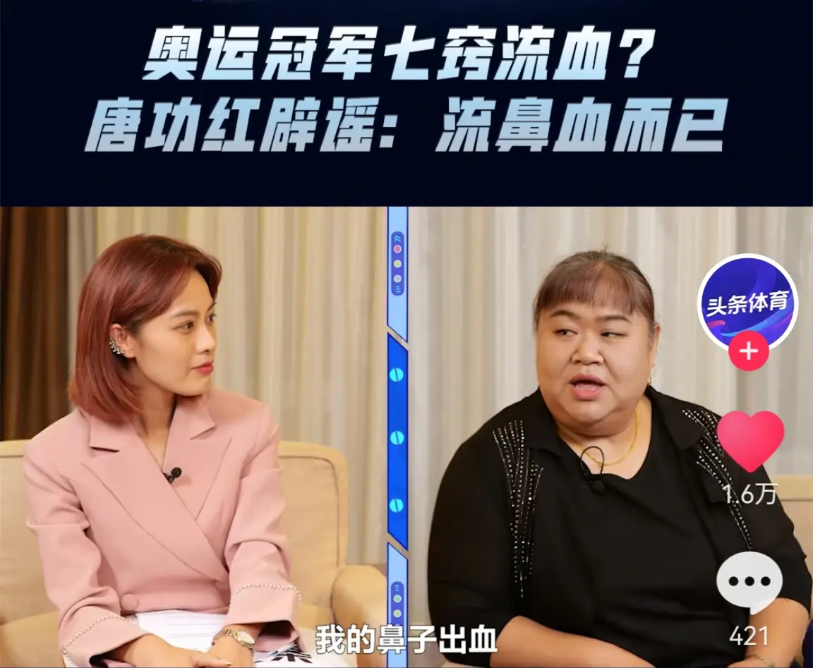 也因此衍生出了唐功红为了夺冠内脏受损、七窍流血,被送到医院ICU抢救的传言。