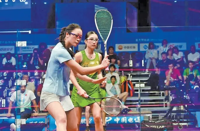 8月9日,成都世运会壁球项目女子单打比赛中,中国小将刘子仪(左)战胜澳大利亚选手。 北京日报记者 金瑶摄