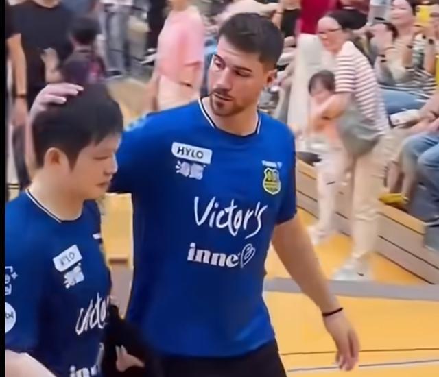 赛后队友弗朗西斯卡的小细节更让人心疼小胖了,因为首秀丢分樊振东自己的压力非常大,而且不出意外小胖在第四轮仍要出场。所以弗朗西斯卡作为队长特意陪着樊振东来到训练馆适应场地,走路的过程中还搂着小胖,摸了一下小胖的头,也是对樊振东表示鼓励。虽然第四局小胖也输了,但是弗朗西斯卡没有任何的不满,而是再次拍了一下樊振东的后背,随后把小胖推到了赛场的中央,让樊振东和自己的球迷进行互动。