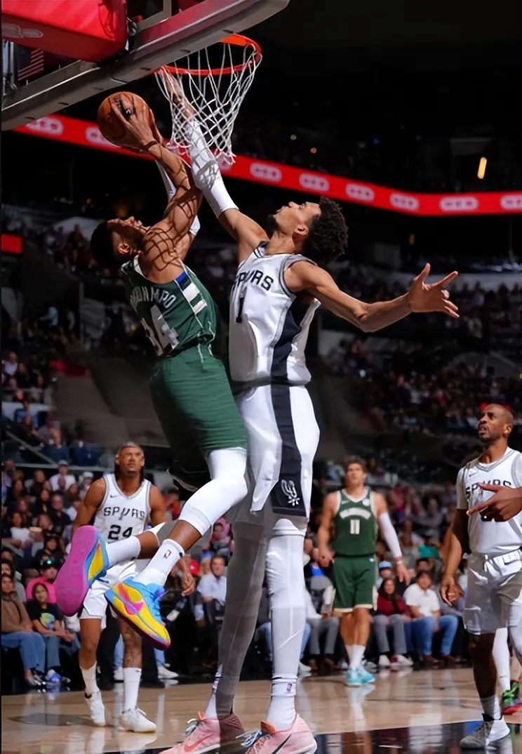 要说身体天赋,字母哥绝对是当今联盟的天花板,同样是内线球员,字母哥冲击力十足,同时还是个魔鬼筋肉人。大部分时间,字母哥只要冲起来,对手就只能犯规才能阻止他了。不过文班亚马的护框,依旧可以限制字母哥。看看两人的对位图片,字母哥飞在空中,而文班只是站着就可以覆盖篮下整个区域,太无解了。