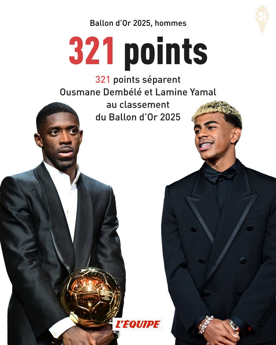 与2024年罗德里(曼城)以微弱优势击败维尼修斯(皇家马德里)不同——当时两人仅相差41分——这位巴黎圣日耳曼前锋在本次评选中以显著的优势击败了他的主要对手亚马尔。事实上,这位法国球员比西班牙国脚多出321分。