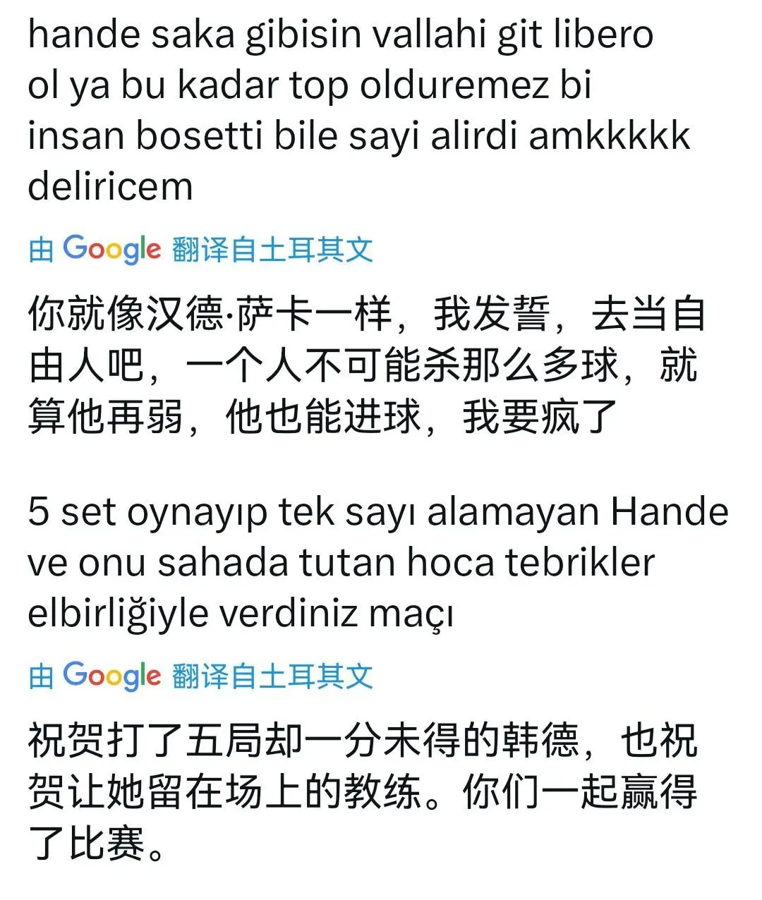 从技术统计来看,土耳其扣球57-61落后,拦网虽然13-6多拿7分,但发球2-5落后,且5局送给日本队31分。本场比赛,土耳其队的主攻巴拉丁打出了17扣0中6失误被拦的数据,成为了球队输球的最大原因,土耳其球迷更是把输球的怒火几乎都喷向了她。