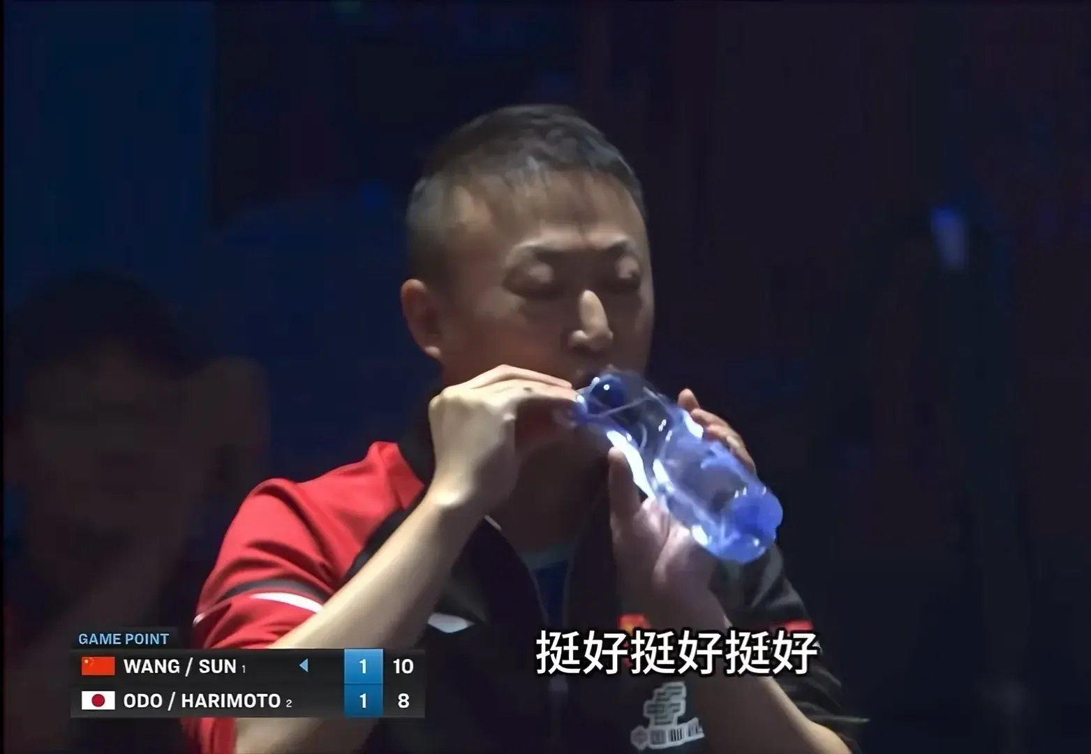 昨天的女双比赛是安排在最后一场,在之前的女单半决赛中,孙颖莎是4-1战胜队友陈熠,晋级决赛;王曼昱4-0战胜队友石洵瑶,晋级决赛。不过俩人还有女双的比赛,马琳教练还得继续上班,这些天比赛,很少看到马琳在场边喝水,昨晚他也紧张了。第三局局点时导播把镜头切到教练席,看到马导正在喝水,嘴里说的:“挺好,挺好,挺好”,实则有些紧张了。