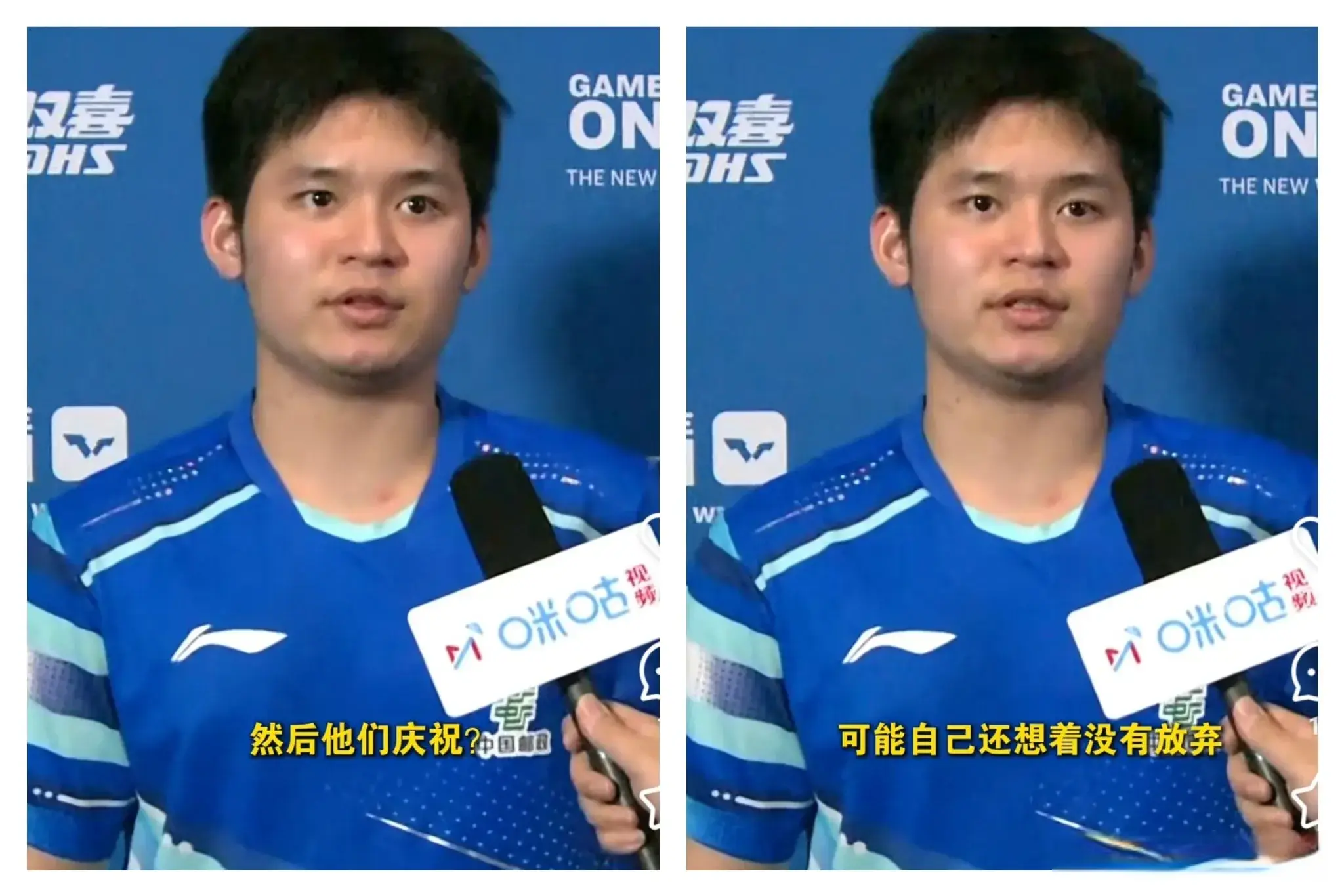 在混采区的采访,小周老师说在第六局林诗栋6:9落后时,一度是连得五分,现场的欧洲观众就已经快要开始在庆祝了,那时候你是怎么调整的?林诗栋说自己还是保持冷静吧,然后他们庆祝,自己还想着没有放弃。所以这就是必胜的信念吧,每一分都不放弃,赛后现场采访时,西蒙也看了林诗栋采访,镜头给到西蒙,西蒙也是一脸的无奈,后悔那么早庆祝了吧。