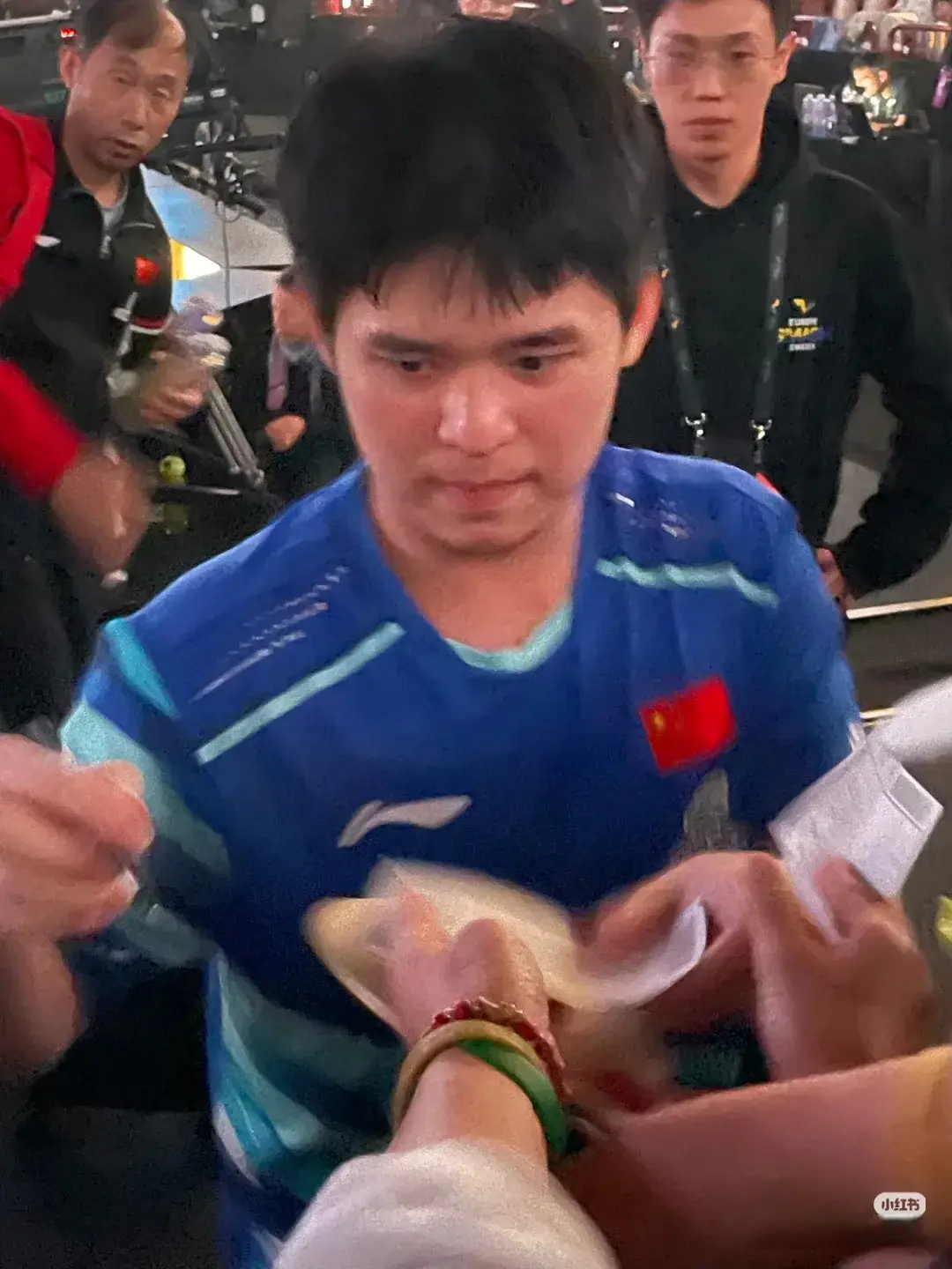 昨晚的男单半决赛之后,林诗栋也过去给现场的球迷签名了,看到队医帮林诗栋背着包,等着他一起离场。赛后林诗栋感谢了现场给他加油的球迷,有了大家的鼓励和支持,就给了他力量。