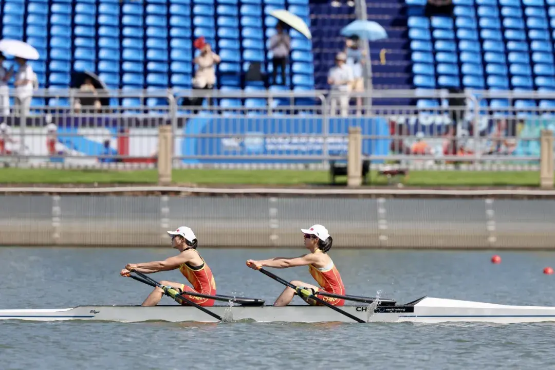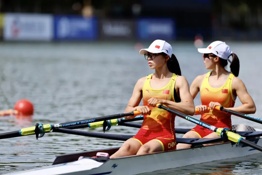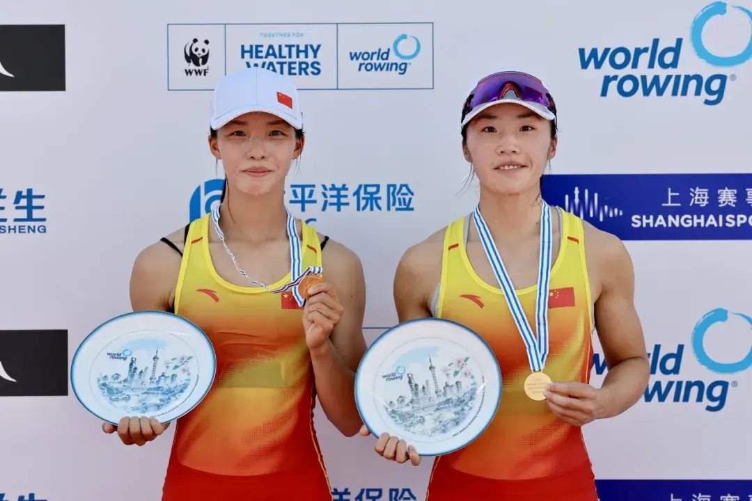 中国组合邹佳琪/富灵斩获女子轻量级双人双桨冠军,这也是本届赛艇世锦赛的首金