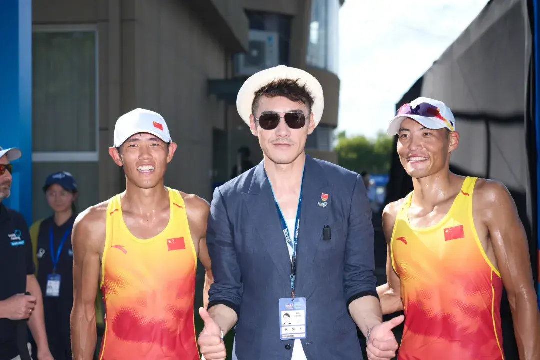 2025世界赛艇锦标赛推广大使胡兵与摘得男子轻量级双人双桨金牌的中国组合李亚伟/孙满合影