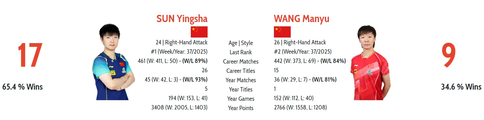 在此之前,两位运动员曾经26次在国际比赛中相遇,其中孙颖莎赢17次、王曼昱赢9次,孙颖莎相对更有优势。至于本站比赛二人都有遇到一定困难,但最终连赢名将会师最后一轮,状态渐入佳境,虽然孙颖莎无论成绩、排名还是战绩都占上风,但王曼昱同样具备超强的实力,所以无论谁夺得冠军都不会让人感到意外。