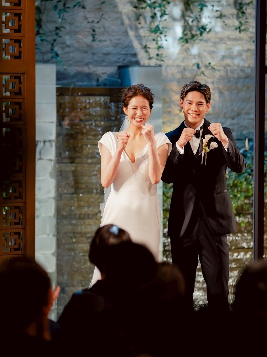 进入婚礼仪式阶段,古贺换上一袭深V设计的纯白礼服,头戴长纱,造型简洁却极具高级感,她与西田站在宾客面前,双手握拳摆出“加油”姿势,满脸喜悦,现场掌声与欢笑不断,这是属于他们的荣耀时刻,也是一场属于运动员的欢乐庆典。