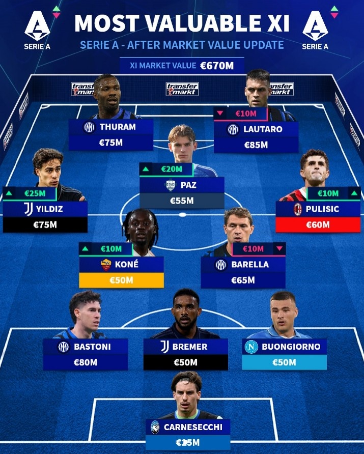 中场:伊尔迪兹(尤文图斯,7500万欧元)、帕斯(科莫,5500万欧元)、普利西奇(AC米兰,6000万欧元)、科内(罗马,5000万欧元)、巴雷拉(国际米兰,6500万欧元)