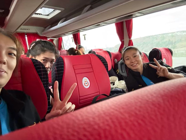 阳光洒在她的脸上,展现出青春活力的一面,画面背后是蓝白相间的现代建筑与葱郁绿树,充满异国风情,在大巴车上的另一张合影中,李盈莹与队友们并排坐在贴有加拉塔萨雷队徽的专车,气氛轻松愉快。