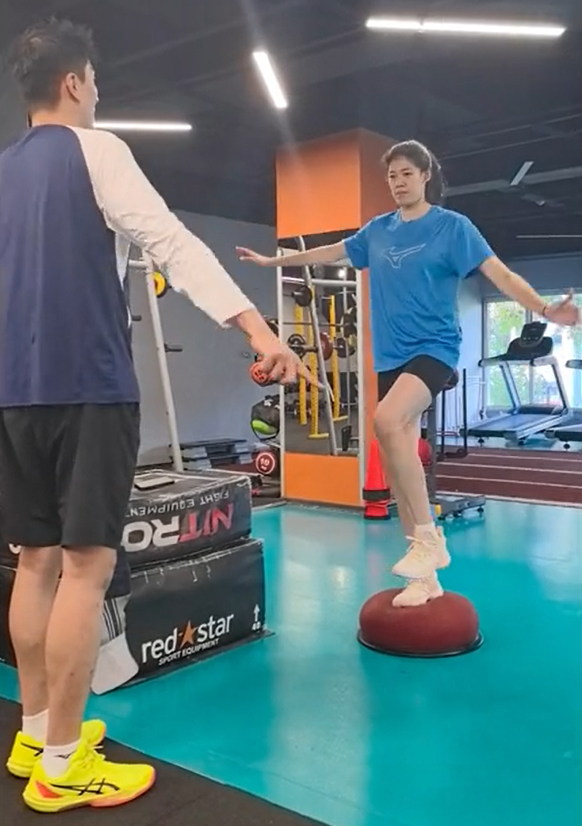 此外,李盈莹还晒出在健身房进行康复训练的画面,她站在平衡半球上,一脚抬起,双手展开,专注地进行核心稳定练习,教练在旁指导,显示出她在伤后依旧刻苦训练、力争尽快恢复的决心。
