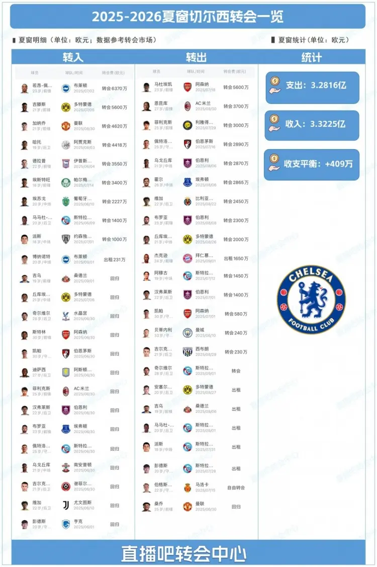 投入3.28亿欧元引进9名球员,出售23名球员赚得3.32亿欧元,切尔西不仅是这个夏窗人员变动幅度最大的英超球队,也是联盟中为数不多既能做好阵容补强,又可以实现盈利的球队,他们已经连续第二年完成了这样的神迹。2024夏窗,切尔西的引援支出为2.39亿欧元,出售球员收入1.98亿欧元,4050万欧元的净投入低于2/3的英超球队,马雷斯卡依靠这班人马完成了英超争四、欧联杯夺冠的任务,世俱杯之旅更是让他们赢得了超过1亿美元的奖金。