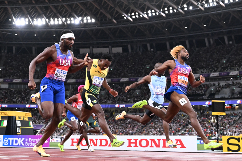9月19日,美国选手莱尔斯(右一)在决赛中。最终,他获得冠军。 当日,2025年世界田径锦标赛男子200米决赛在日本东京举行。 新华社记者 江汉 摄