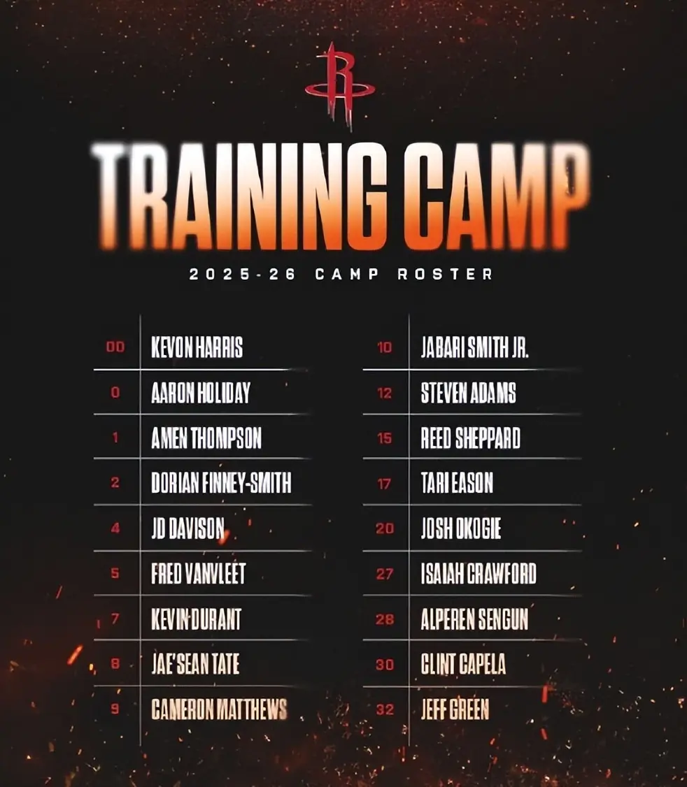 火箭公布了新赛季18人训练营大名单以及球衣号码,其中新援控卫戴维森将会穿上杰伦-格林走之后空出来的4号球衣。