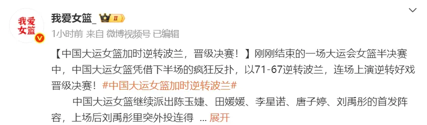2025年女篮世大运半决赛正式打响,中国队迎战波兰队。中国队在上半场一度落后对手7分的情况下,下半场开启绝地反击,最终通过加时赛成功逆转波兰,以71-67击败对手,成功杀进世大运决赛。全场比赛,刘禹彤、田媛媛、唐子婷以及陈玉婕四人成为了中国队取胜的关键,田媛媛加时赛连得7分,更是成为了比赛的转折点。击败波兰这个欧洲劲旅后,中国队将有望冲击世界冠军。