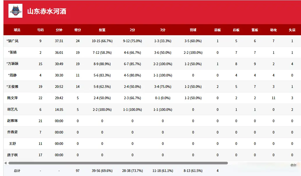 从数据来看,山东女篮首发5人全部得分上双,邹广凤15投10中, 独砍24分6篮板7助攻,张婧19分7篮板,万颖颖19分9篮板,周静11分4篮板4助攻,王俊雅14分7篮板3助攻,隋文萍5分2篮板11助攻。北京队仅2人得分上双,豆中秋13分,王艺慧13分。