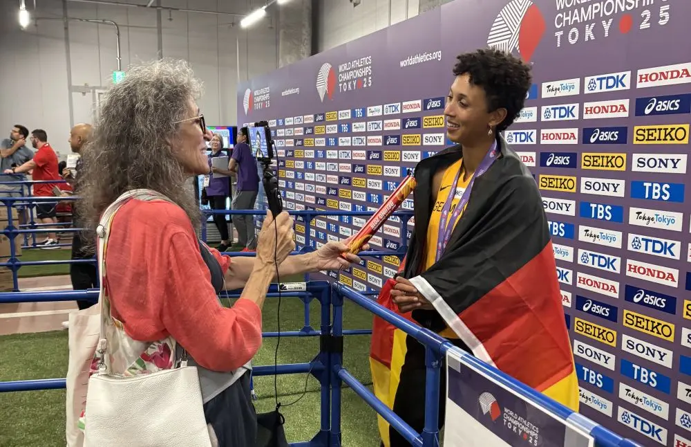 安娜·勒加尼(左)手持2015年北京田径世锦赛的接力棒在东京采访。 新华社记者 王沁鸥 摄