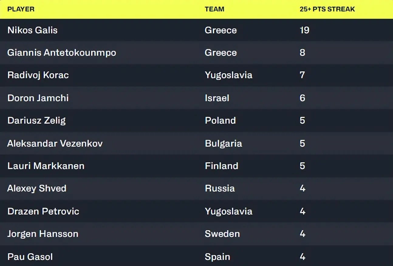 在欧洲杯的历史上,只有一位球员有比这更好的连续得分纪录:希腊传奇球星尼科斯-加利斯,他连续19场欧洲杯至少得到25分。