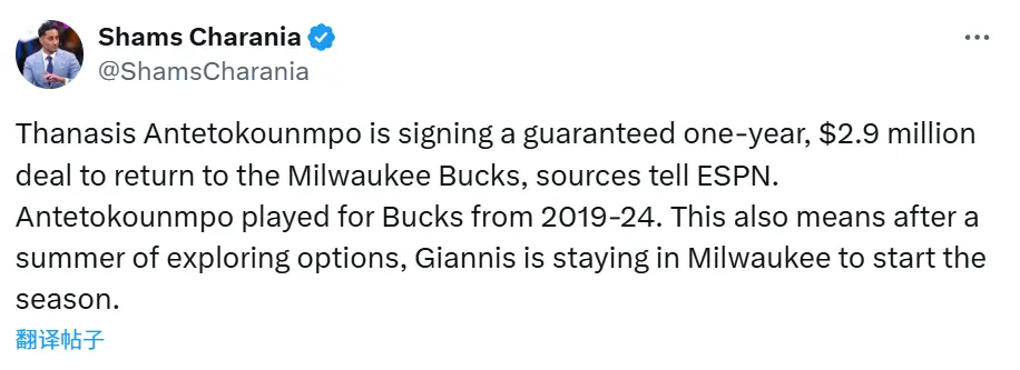 就在不久前,名记Shams报道称,随着字母哥的哥哥萨纳西斯与雄鹿签下了一份一年290万美元的保障合同,这也意味着字母哥在经历了一个夏天的探索之后,将留在雄鹿开启新赛季。