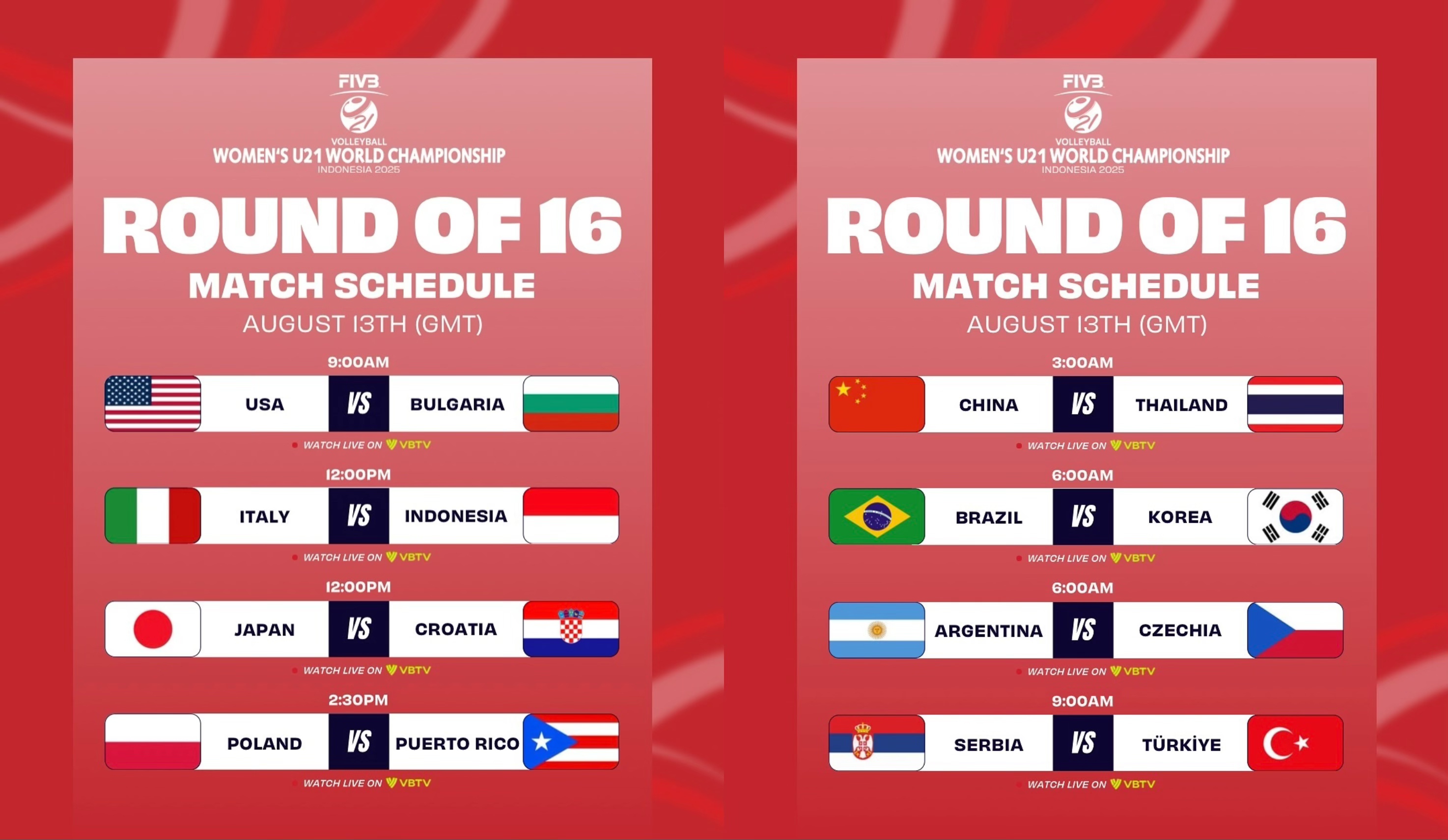 具体对阵如下【上半区】巴西vs韩国、阿根廷vs捷克、中国vs泰国、意大利vs印尼【下半区】日本vs克罗地亚、塞尔维亚vs土耳其、美国vs保加利亚、波兰vs波多黎各