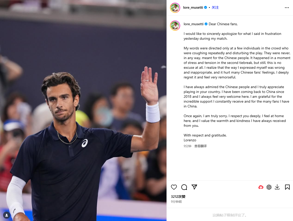 2025中网男单首轮,意大利选手穆塞蒂苦战三盘,艰难击败法国选手佩里卡尔晋级。不过在第二盘抢七中,率先取得迷你破发的穆塞蒂打丢正手机会球。丢分后,他将原因归咎于看台上的咳嗽声,随后他不但模仿球迷咳嗽,还发表不友善言论。