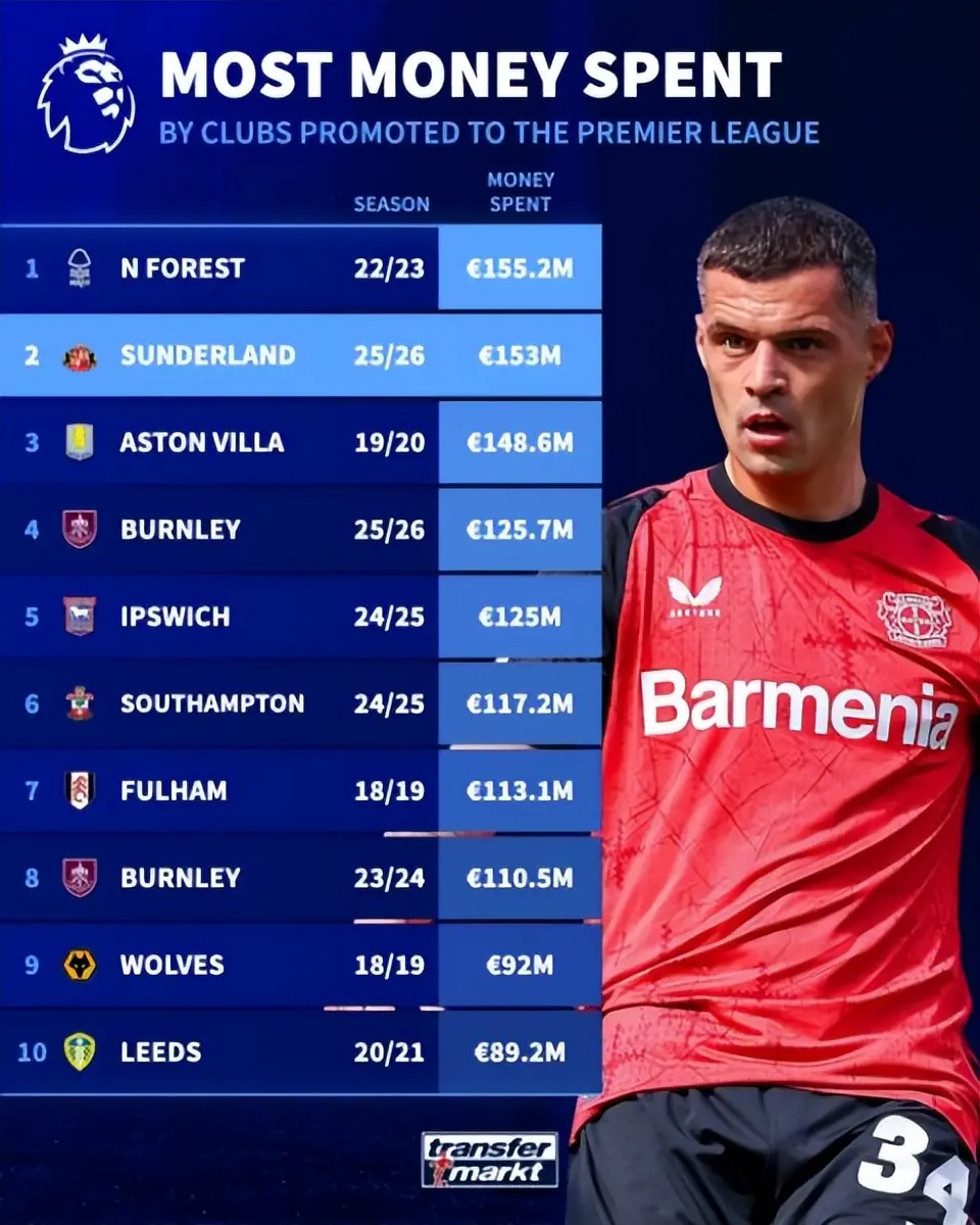 对于大多数升入英超联赛的俱乐部来说,主要目标就是生存。过去两个赛季,6支升班马球队全部在首个赛季便降级。这给了桑德兰、伯恩利等2025-26赛季升班马球队提了醒。要想生存,就要加大投入。