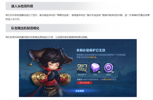 事实上,仅就《王者荣耀》而言,也在如此做,例如《7月3日正式服S40赛季“命若星火”版本更新公告》就有“送人头检测升级”:对识别检测算法进行了迭代,解决被追杀时的“策略性送塔”、越塔强杀时的“操作失误送塔” 等操作被误判的问题,进一步准确判罚真正恶意的送人头行为。