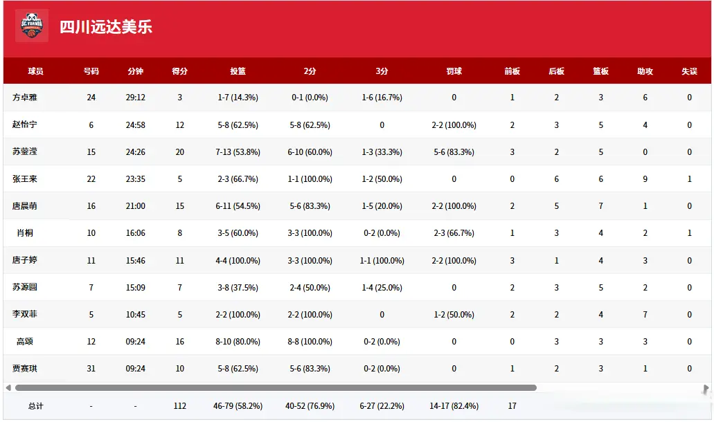 从数据来看,四川女篮打得真好,不愧是卫冕冠军,即便李梦王思雨不在,依旧是碾压对手。全队6人得分上双,苏蓥滢20分5篮板,赵怡宁12分5篮板4助攻,唐晨萌15分7篮板,唐子婷4中4拿到11分4篮板3助攻,高颂10投8中,拿到16分3篮板3助攻,贾赛琪8投5中,拿到10分3篮板。河北队栾钰婷13分7助攻,任仰鑫22分4篮板。