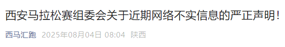 今天(8月4日)西安马拉松赛组委会发布关于近期网络不实信息的严正声明 ,详情如下。