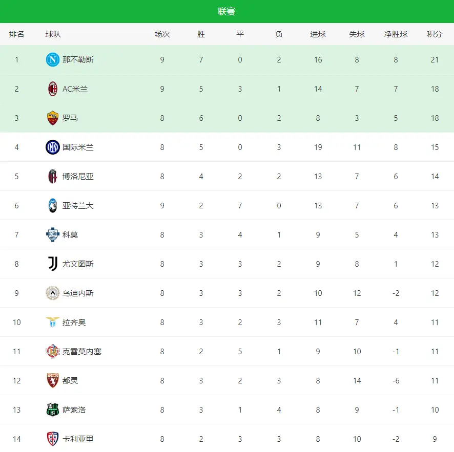 意大利方面,卫冕冠军那不勒斯客场1-0险胜莱切,内雷斯助攻安古伊萨打入全场唯一进球,拿下联赛2连胜,9点7胜2负,拿到21分,排名榜首位置,领先身后的AC米兰和罗马3个积分。
