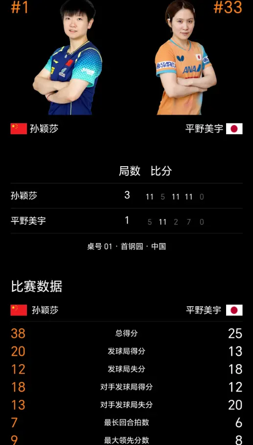首局一上来,平野美宇就打得很有针对性,通过反手长球,给自己创造出了率先上手的空间,开局就建立起了3-1的领先,不过在孙颖莎逐渐找到状态后,开始展现自己进攻的威胁,高质量拧拉后的快劈长,让平野美宇很快陷入被动处境,在连得7分之后,小魔王瞬间把比分反超为了8-3,轻松以11-5取得了开门红。