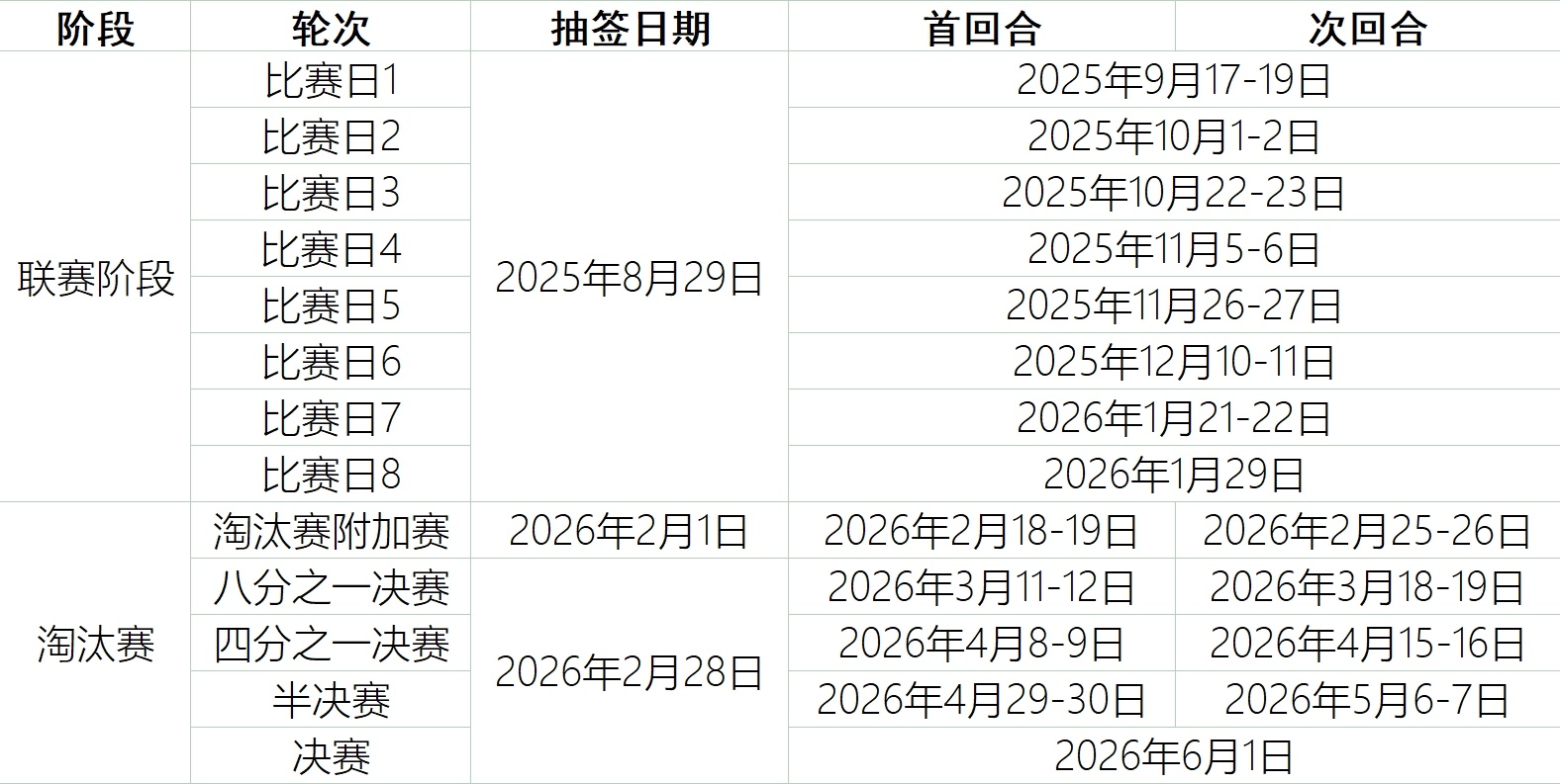 抽签结束时,所有的球队都将得知自己的8个对手,具体的赛程、比赛日期和开球时间将在之后制定,并最迟于欧洲中部时间2025年8月30日公布。