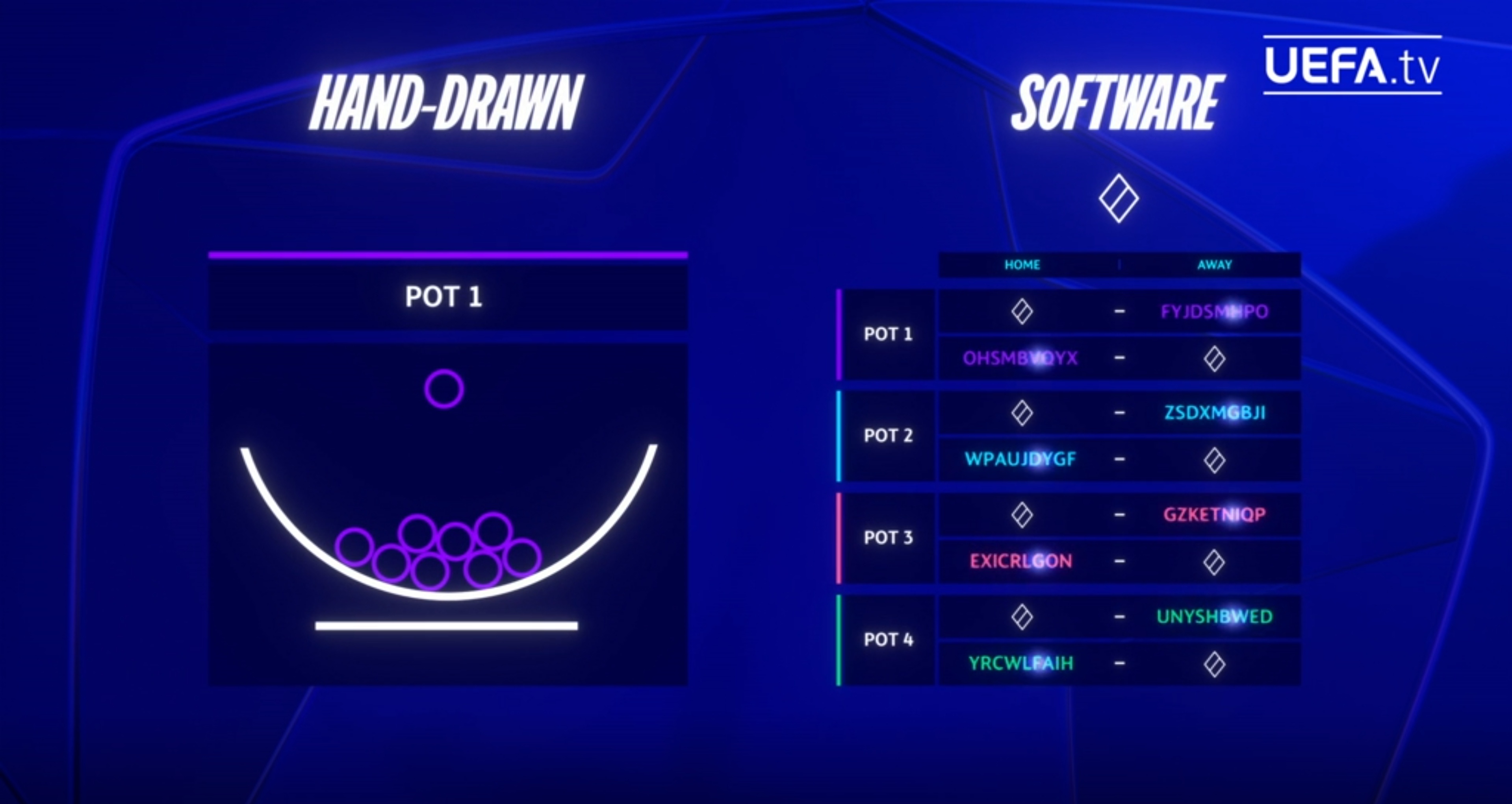以此流程,从一档球队开始,依次为所有9支一档队伍分配8个对手。二、三、四档球队继续依次执行此抽签流程,直到所有队伍都被分配到了8个对手。欧足联表示,软件将在规定的抽签原则内保证完全的随机性,同时确保所有队伍的抽签能够顺利完成。