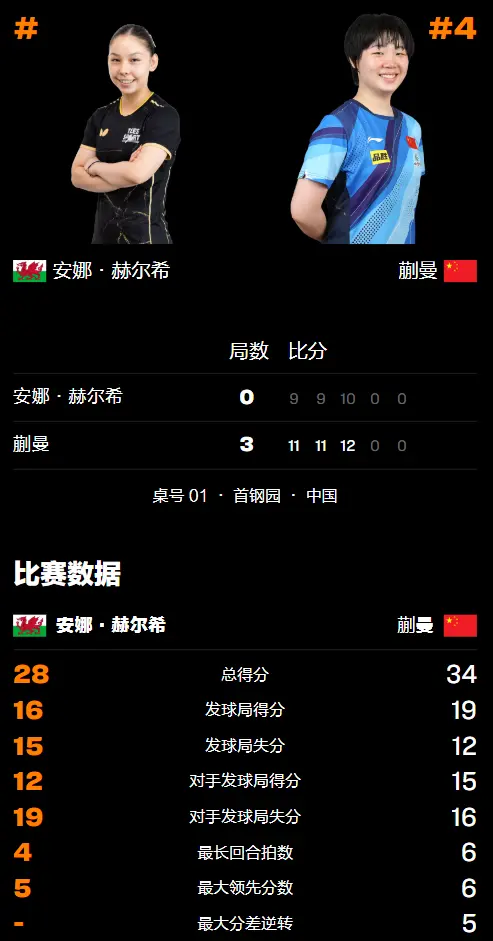 两名选手在19年的意大利公开赛上,曾经有过一次交锋,当时蒯曼轻松以3-0获得了胜利,在本届中国大满贯首轮,蒯曼的表现也非常神勇,横扫了澳大利亚名将池旼亨,而安娜·赫西则以3-1把葡萄牙选手邵洁妮挑落马下。
