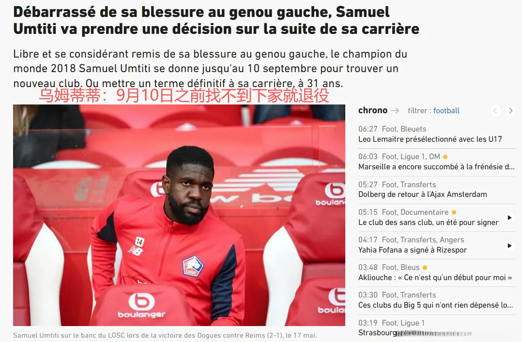 7月1日,乌姆蒂蒂与里尔的合同到期,法国“玻璃人”处于无球可踢的状态。最近7年,乌姆蒂蒂总共只有94次出场,养伤时间加起来有3年之久。《队报》指出,乌姆蒂蒂的左膝伤势已经痊愈,他给自己设定期限——如果在9月10日之前,还没有接到邀约、找到新东家,他将选择挂靴。