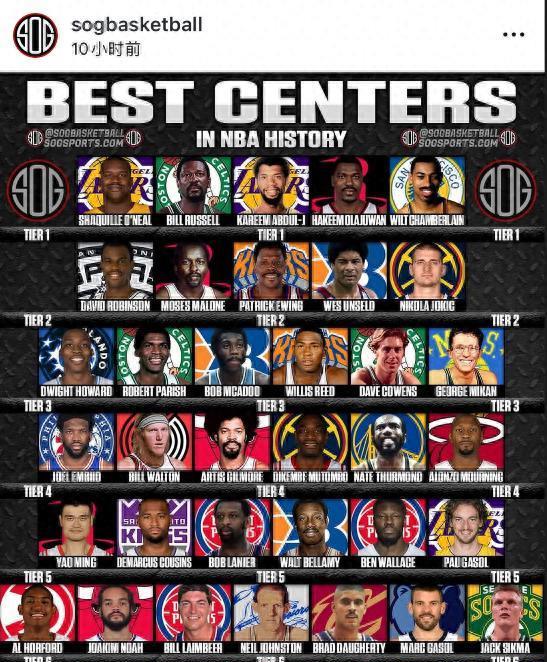 北京时间9月24日,美国媒体Sogbasketball为历史最佳中锋分成7个档次,现役只有约基奇、恩比德、霍福德、大洛、戈贝尔五人入内,排位最高的约基奇第二档。