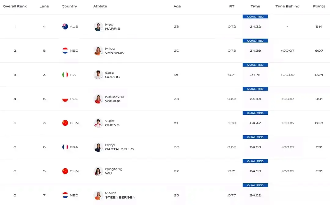 女子50米自由泳两位中国选手程玉洁游出24秒47,吴卿风则是24秒53,包揽小组前二,总排名第五和第六顺利闯进决赛。