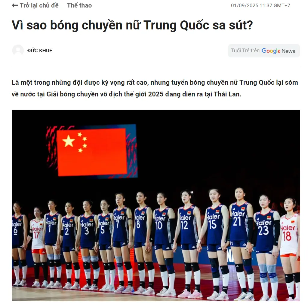北京时间9月1日,泰国媒体《Bao Tuoi TRE》长文解析了中国女排为何在世锦赛衰落的如此迅速。2025年世锦赛中国队止步16强,最终的排名是第九名,淘汰赛第一场连法国队都没有打过,全程被法国按着打。