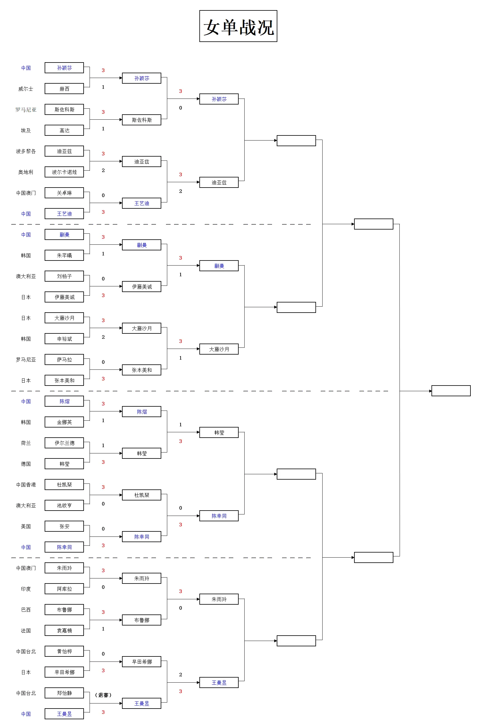 迪亚兹(波多黎各)3-2王艺迪(中国):这场比赛的结果出乎了许多球迷的意料,因为迪亚兹此前从未在常规赛制中赢过国乒世界冠军,与王艺迪6次交手全部败北,然而这次她却成为了第一位突破中国队主力的外协会运动员。
