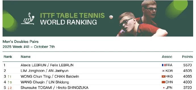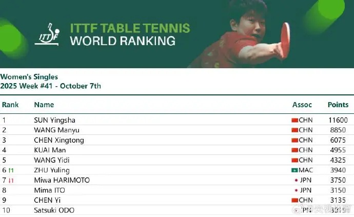 国际乒联公布2025年第41周世界排名