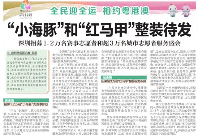 “我在深圳长大,从小就知道志愿服务是深圳的城市名片,能以十五运会和残特奥会志愿者身份参与赛会服务,这份荣耀感与责任感让我心潮澎湃。”来自深圳职业技术大学的赛会志愿者冯智敏说,“街头巷尾的赛事宣传、运动员拼搏身影、系统培训中团队协作的温暖,都让我对这场家乡盛会充满期待。”